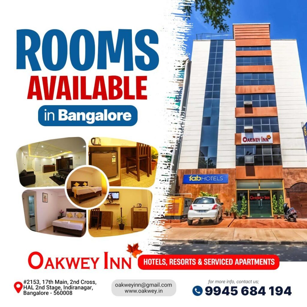 Oakwey Inn is a premier 3-star hotel located in the heart of Indiranagar, Bangalore’s most vibrant hub. Designed for both business and leisure travelers, we offer 24 well-appointed, soundproofed rooms featuring modern amenities like high-speed Wi-Fi, air conditioning, and LCD televisions. Our guests enjoy exceptional hospitality, a 24-hour front desk, and a peaceful atmosphere just minutes from major corporate offices and attractions like Brigade Road. Experience comfort, convenience, and superior service at an unbeatable value during your stay in the Garden City.